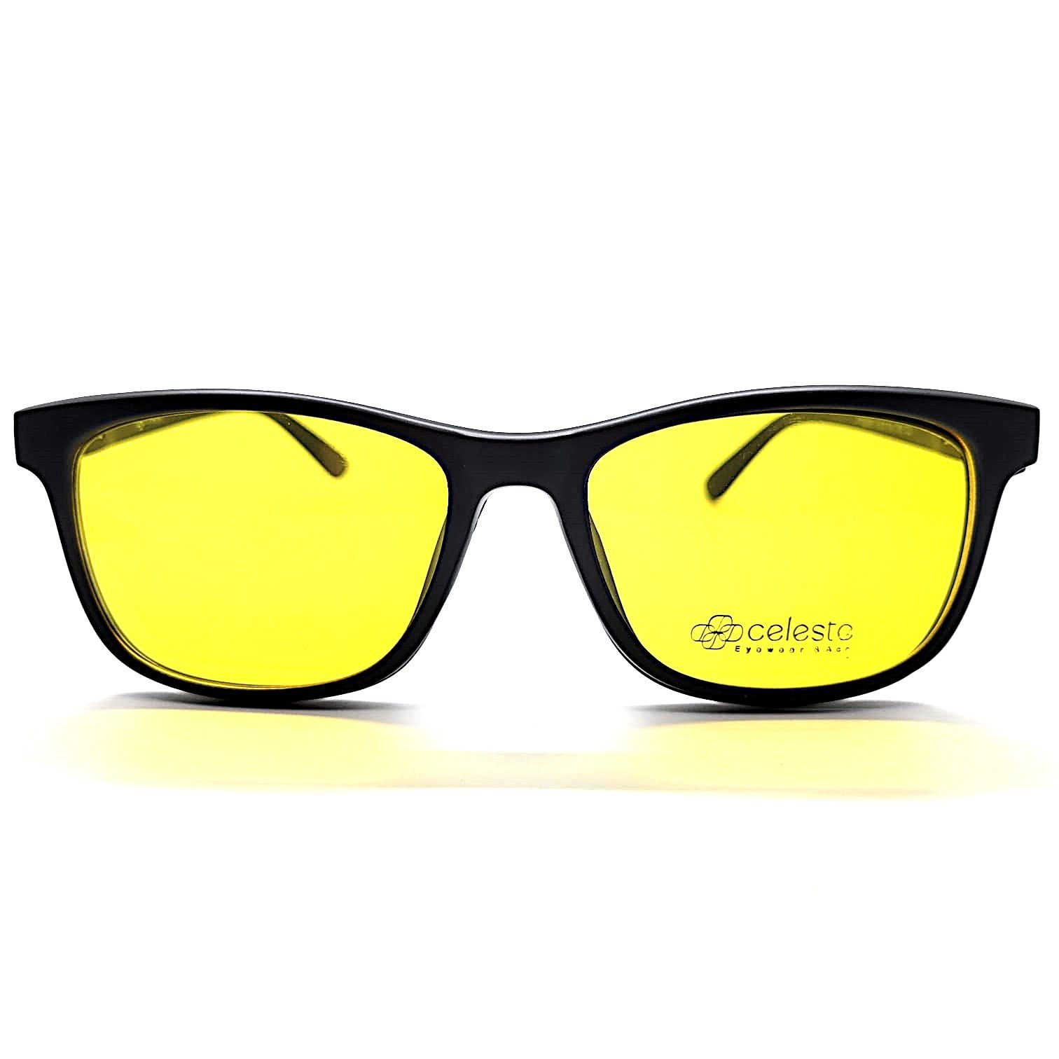 Armazón negro con detalles metálicos y doble clip magnético: