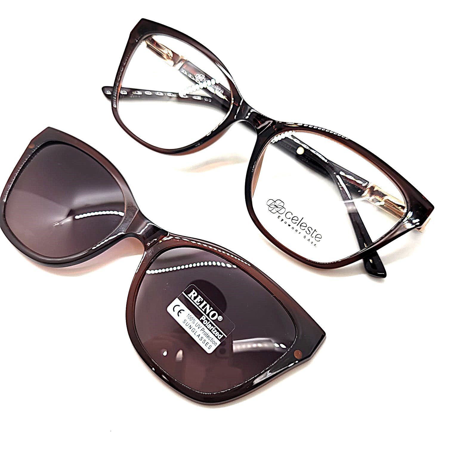 Diseño elegante en color marrón con efecto degradé.Clip solar polarizado REINO con protección UV.Una opción versátil y sofisticada para uso diario.