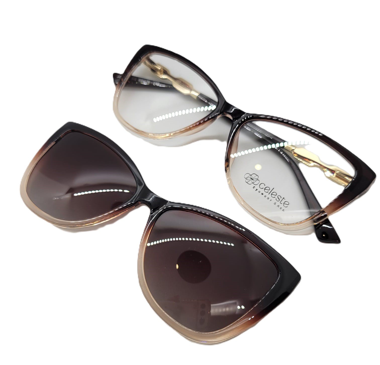 Diseño elegante en forma de mariposa con acabado degradé caramelo.Incluye clip solar con filtro UV, ideal para exteriores.Estilo refinado, cómodo y práctico para el uso diario.