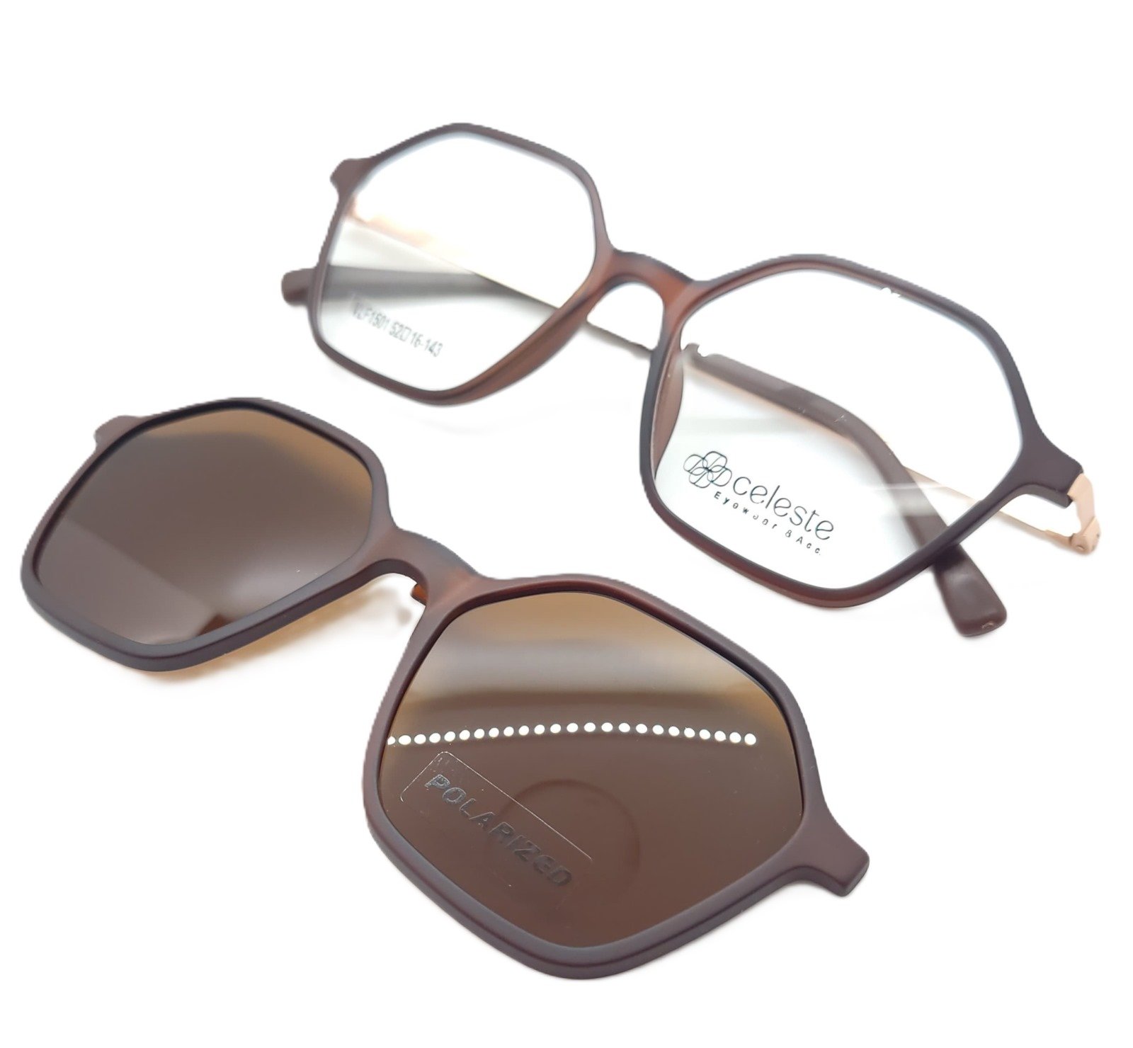 Diseño moderno con forma geométrica y terminación en marrón mate.Clip solar polarizado incluido para máxima protección y funcionalidad.Un modelo ligero y con carácter, ideal para uso diario.