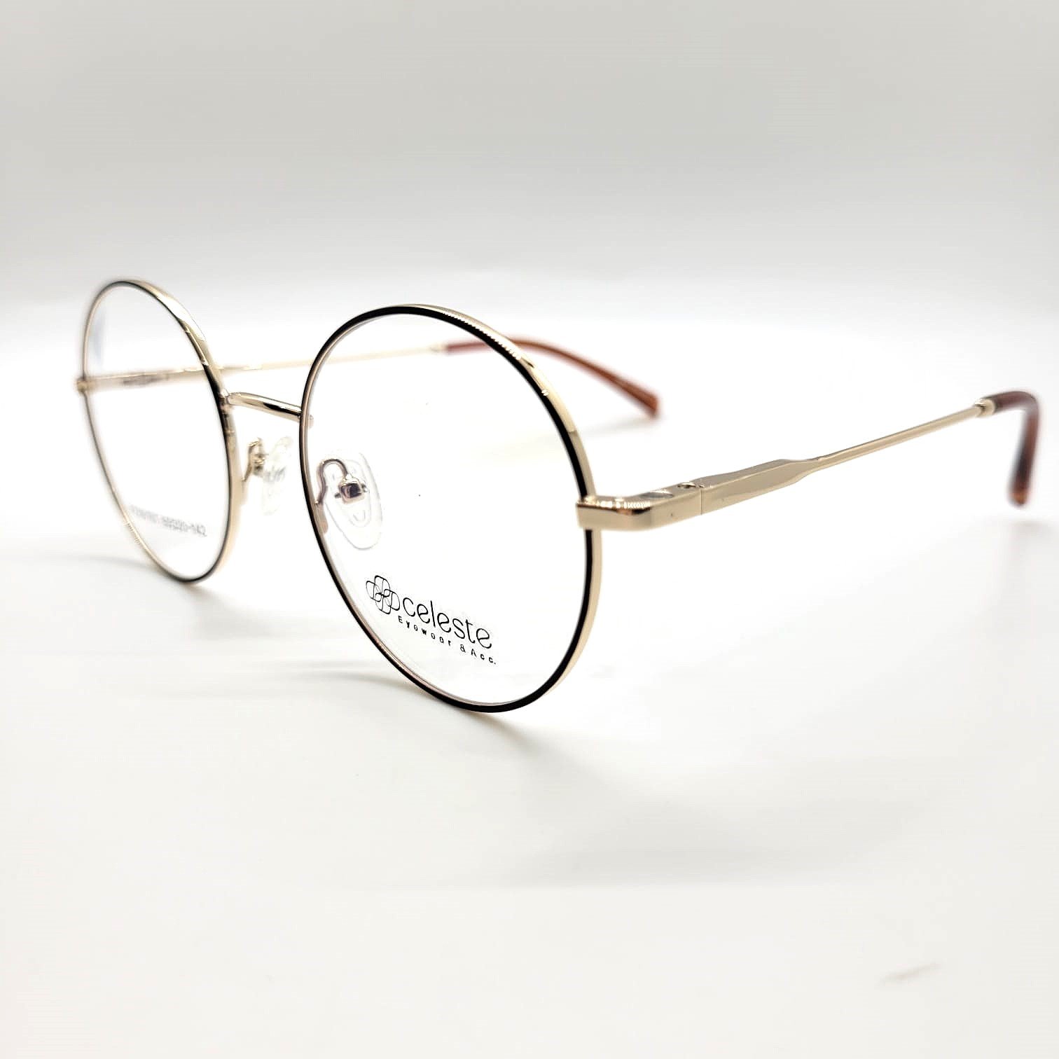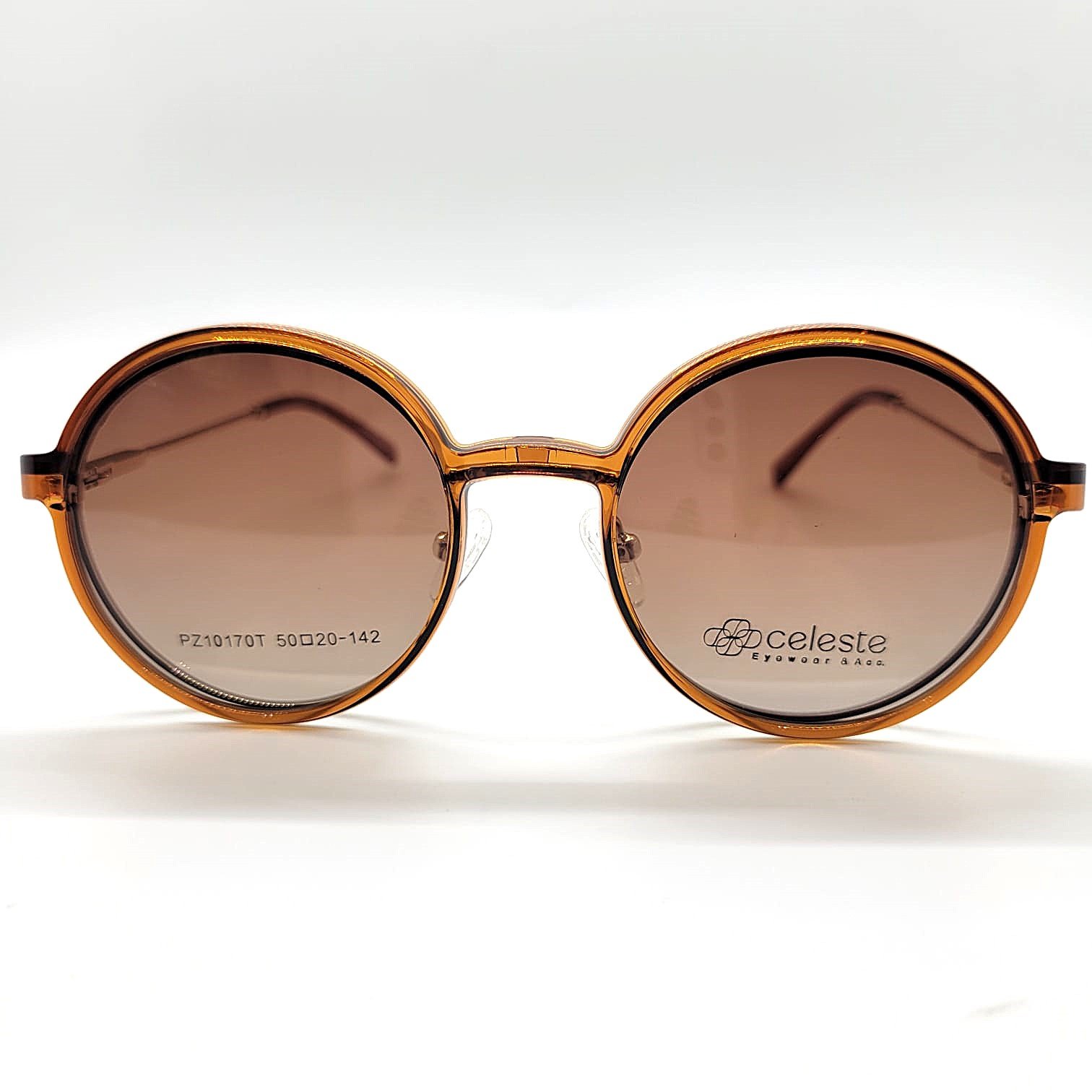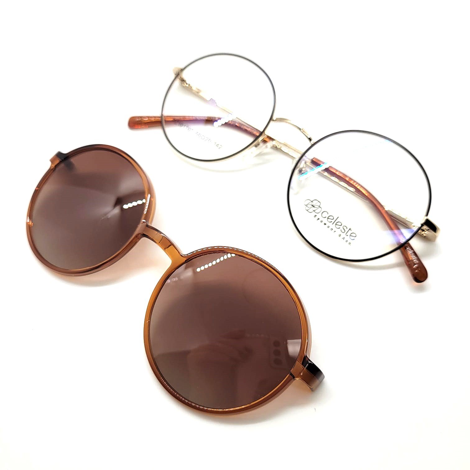 Diseño redondo metálico con terminaciones en dorado y varillas ámbar. Incluye clip solar marrón a tono para un look vintage y funcional. Perfecto para quienes buscan elegancia con personalidad.