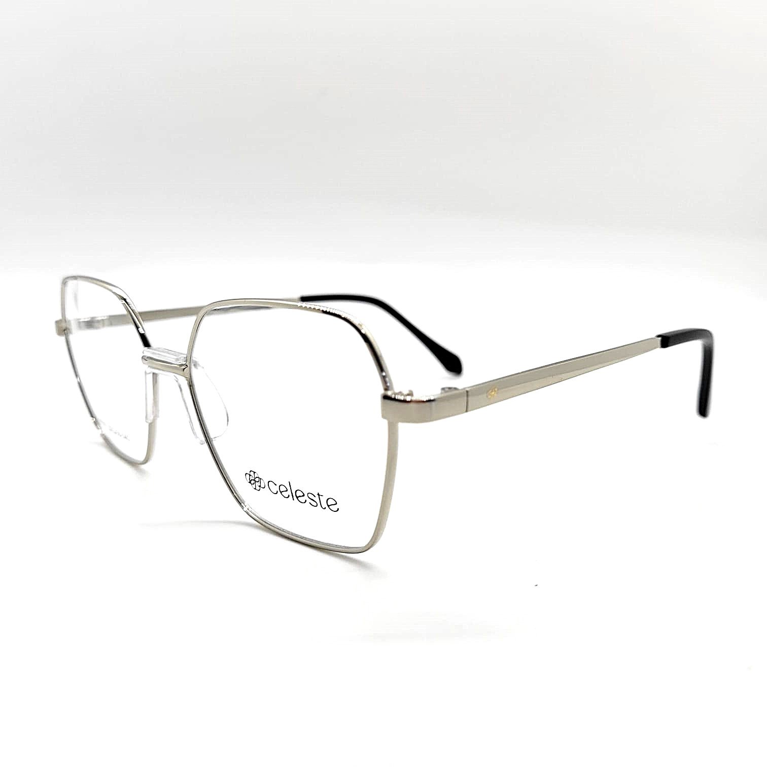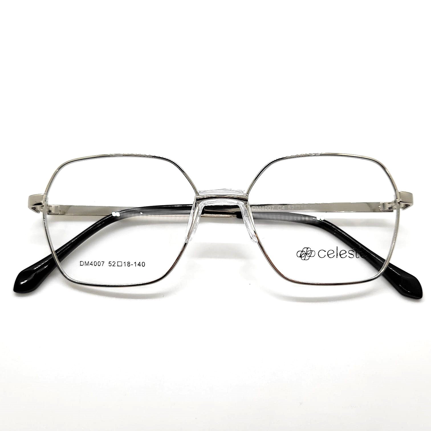 Montura metálica plateada con forma geométrica moderna y delicada. Un diseño versátil que aporta originalidad con un estilo liviano y sofisticado.