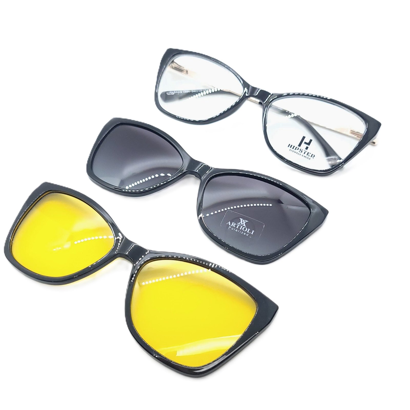 Incluye dos clips magnéticos intercambiables: lente solar polarizado UV 400 y filtro amarillo antirreflejo para conducción nocturna.