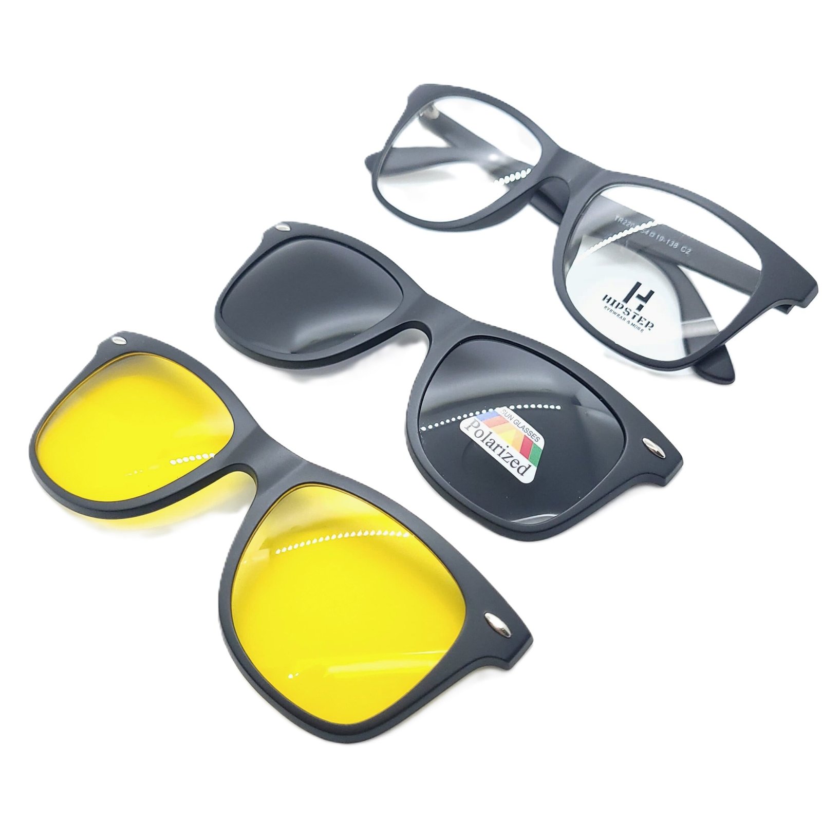 Incluye dos clips magnéticos: lente solar polarizado UV 400 y filtro amarillo antirreflejo para conducción nocturna.