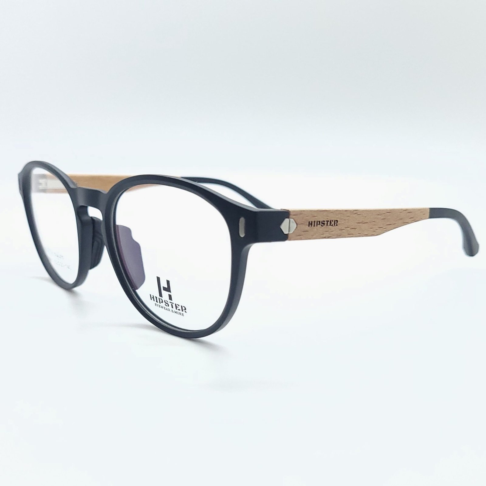 Armazón redondo negro mate con varillas símil madera, liviano y flexible.