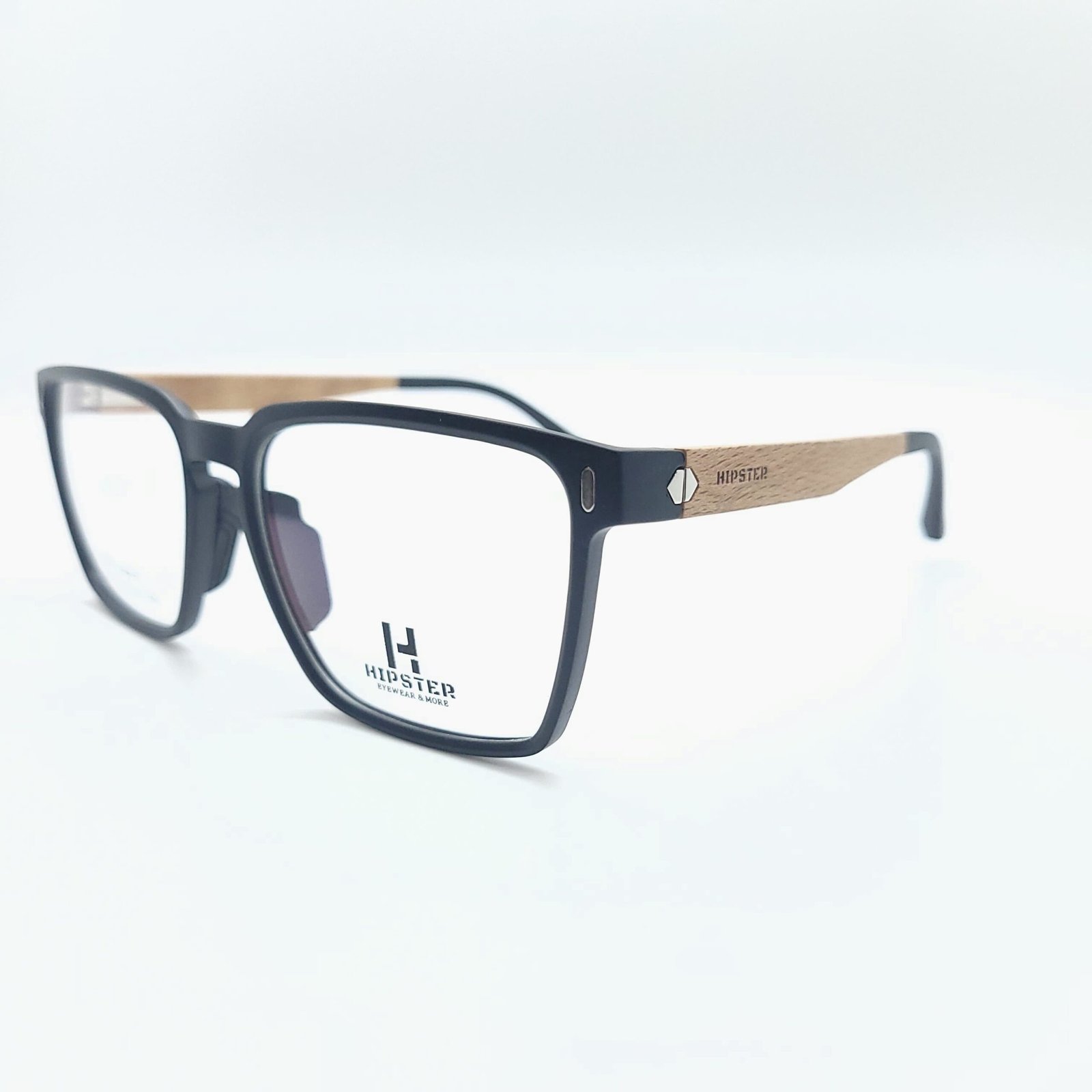 Armazón rectangular negro mate con varillas símil madera, liviano y flexible.