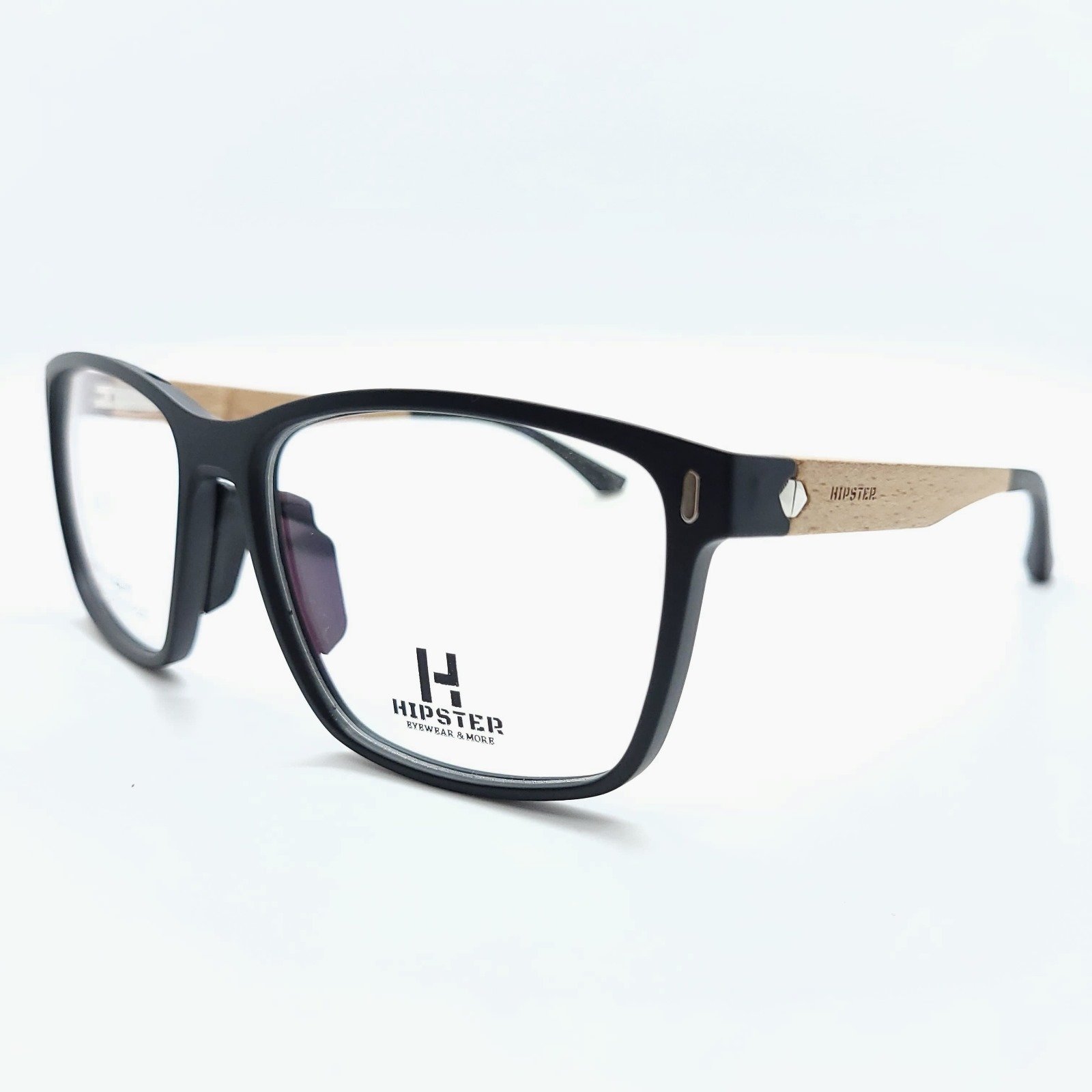 Montura rectangular negro con varillas imitación madera clara.