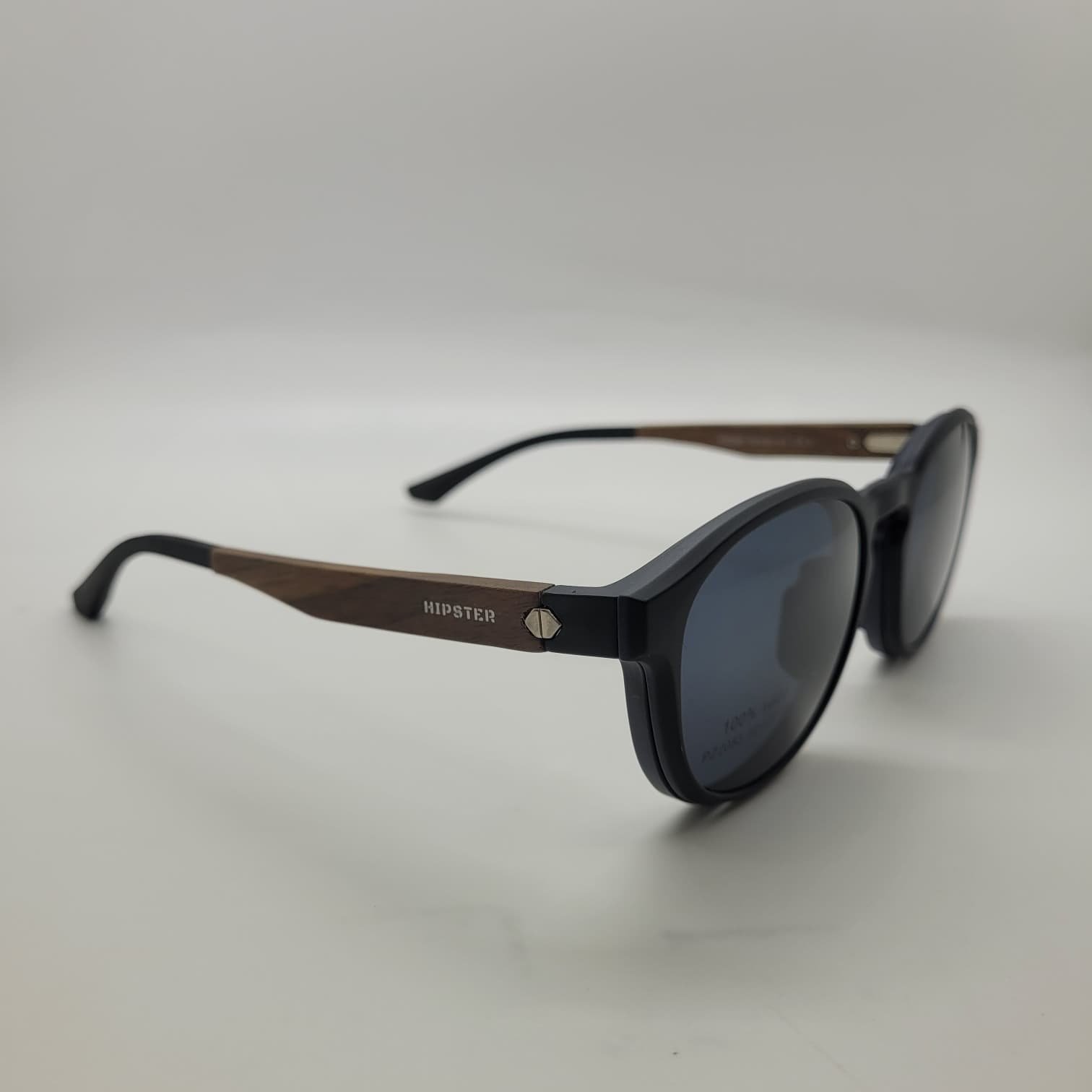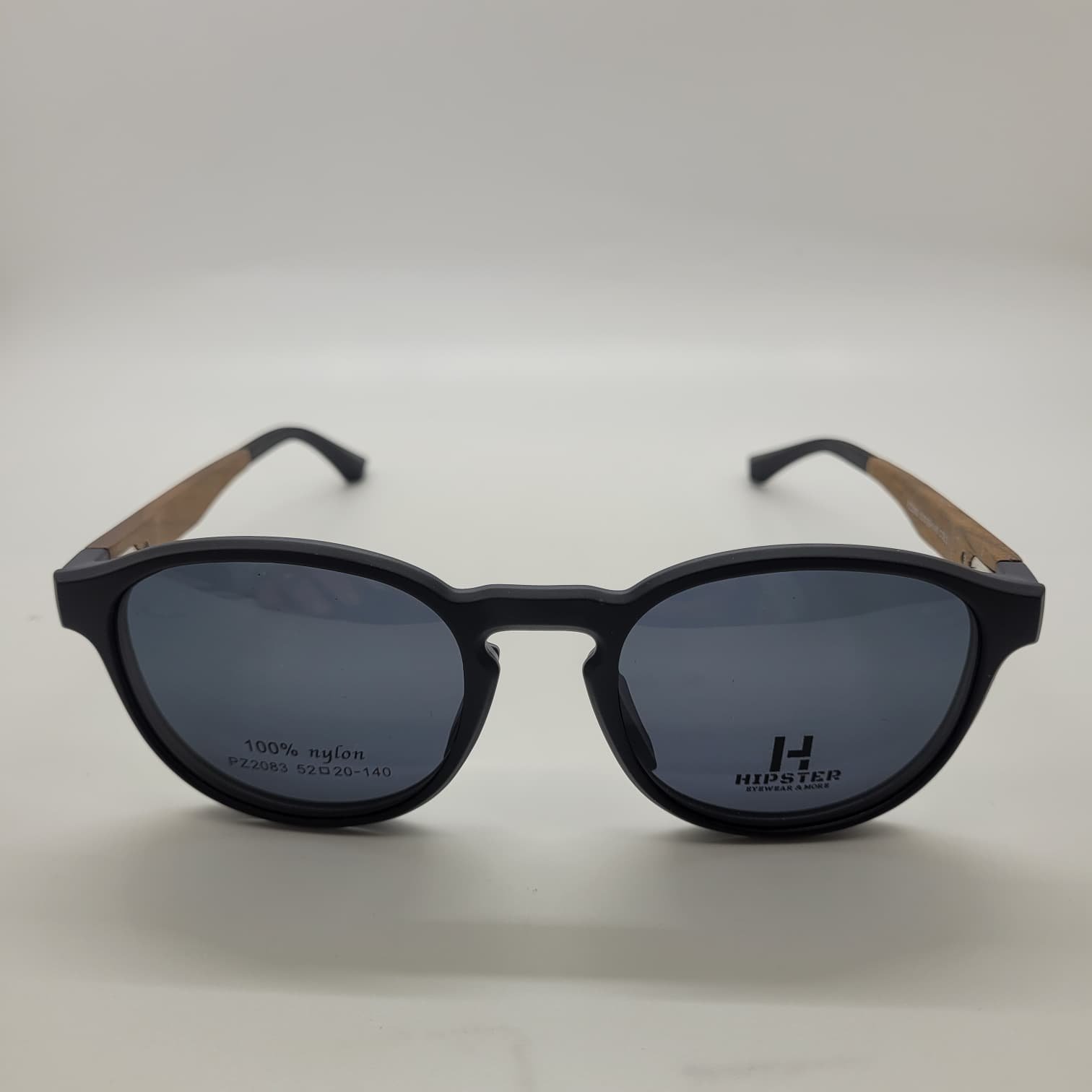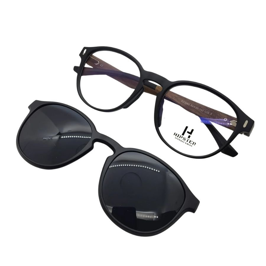 Armazón liviano en color negro con detalles en imitación madera. Incluye clip-on solar negro para protección y practicidad. Ideal para quienes buscan un diseño moderno con un toque natural.