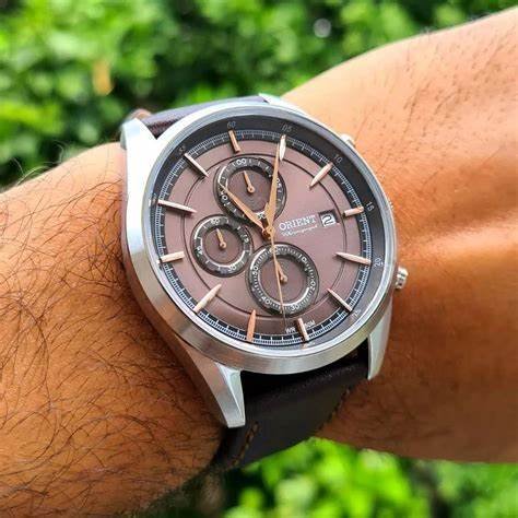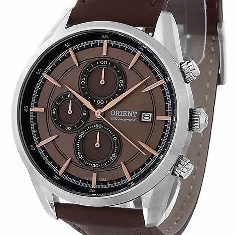 Reloj cronógrafo elegante y funcional. Su esfera marrón con detalles en cobre y correa de cuero marrón le otorgan un estilo clásico y sofisticado, ideal para el uso diario o eventos formales.